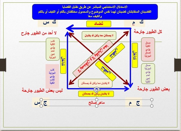 يجب أن نذكر التقابل يكون بين أي القضايا لكل منهم والإضافة لحكم كل منهم ولماذا تسمى تضاد أو دخول تحت التضاد